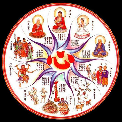 如(乙)表,「一念三千」。先根據《華嚴》的講法,所有一切的眾生,都離不開十法界,有四聖法界、六凡法界。「十界各具十法界」,就是百法界了。而每一界裡頭,又根據《法華經》說「十如是」:即如是相、如是性、如是體、如是力、如是作、如是因、如是緣、如是果、如是報,乃至於如是本末究竟等,從十個方面來分析它。
