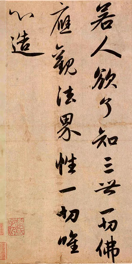 「亦名中道義」。「中道」即「實相」,這是宇宙萬有的真實本體,它非空非有,但又亦空亦有,這道理十分深奧,唯有佛能夠徹見徹了。那就是我們的真如本性。總體而言,在一個因緣所生法當中,我們可以看到它「空」的一面(我說即是空),也可以看到它「假」的一面(亦名為假名),同時還可以看到它「中」的一面(亦名中道義)。這是慧文禪師在讀《中論》中的這首偈子時,所了悟的空、假、中「三觀」的道理,這在後來的天臺學當中,是相當重要的。