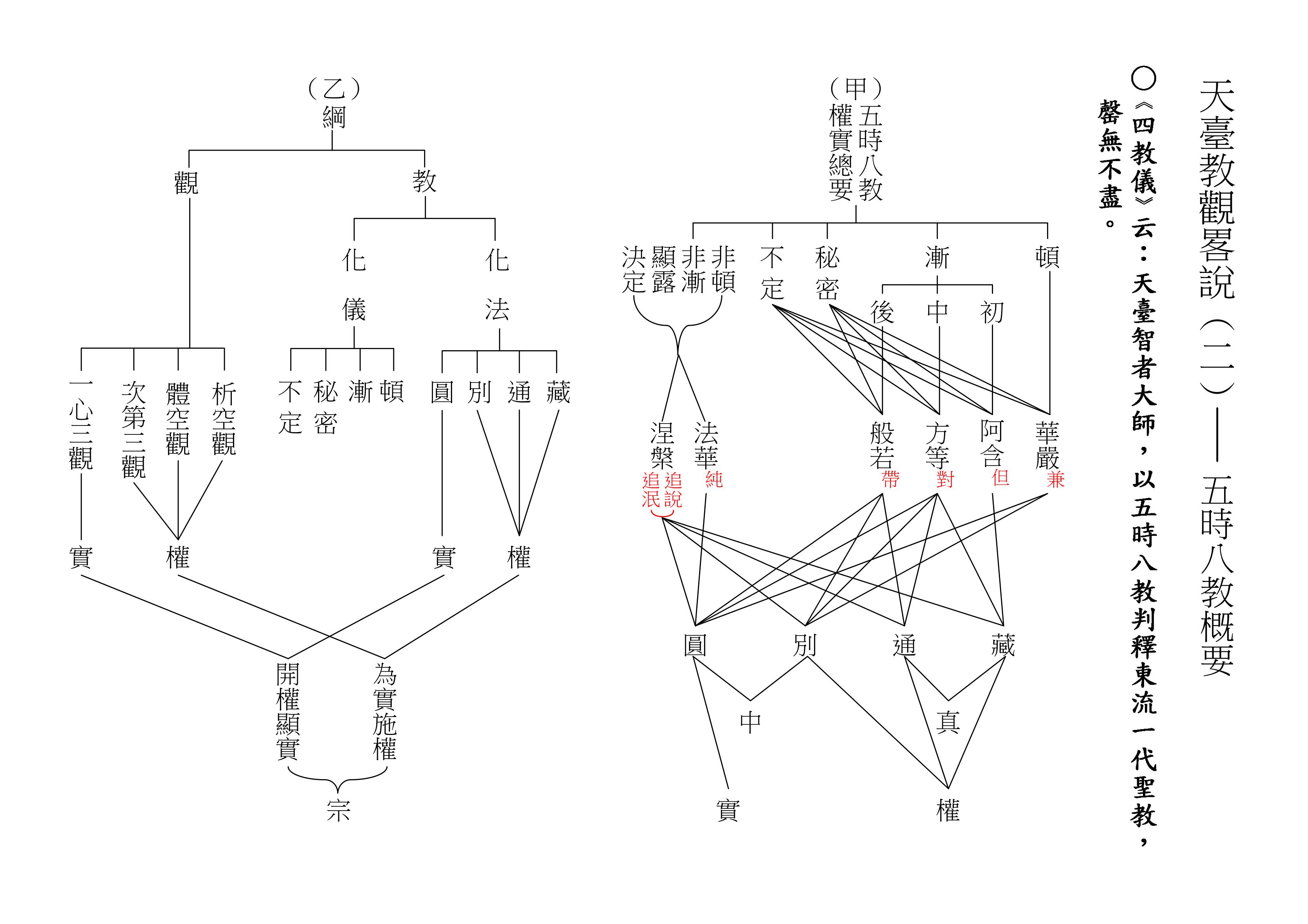 請翻開《天臺教觀略說》的第二表。上回提到整個天臺學內容的大綱領——「五時八教」,其實也是釋迦牟尼佛一代時教的大綱領。「五時」已介紹過,接著講「八教」,就是釋迦牟尼佛度化眾生的八種教法。請先參考(乙)表——這其中有「教」有「觀」。