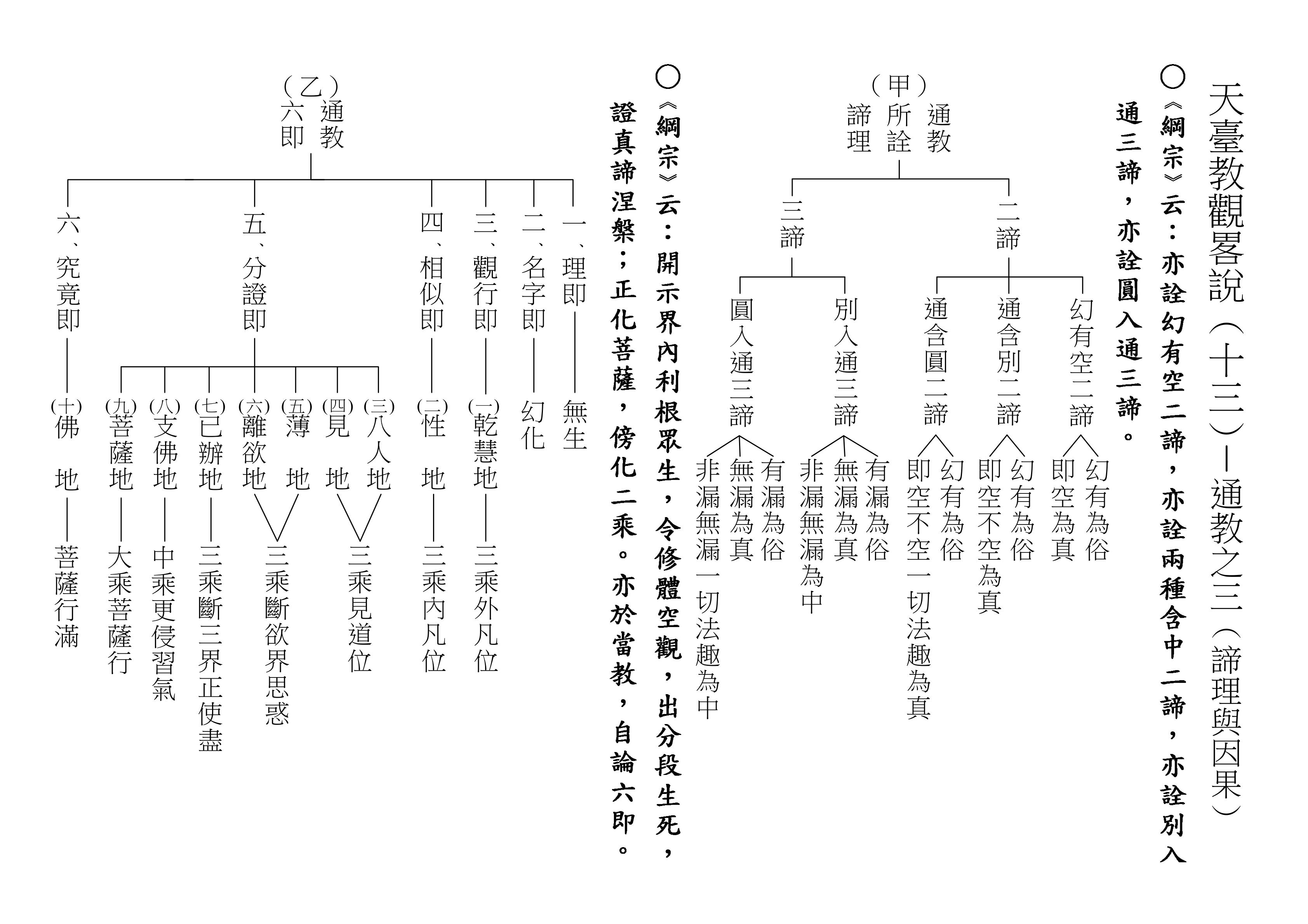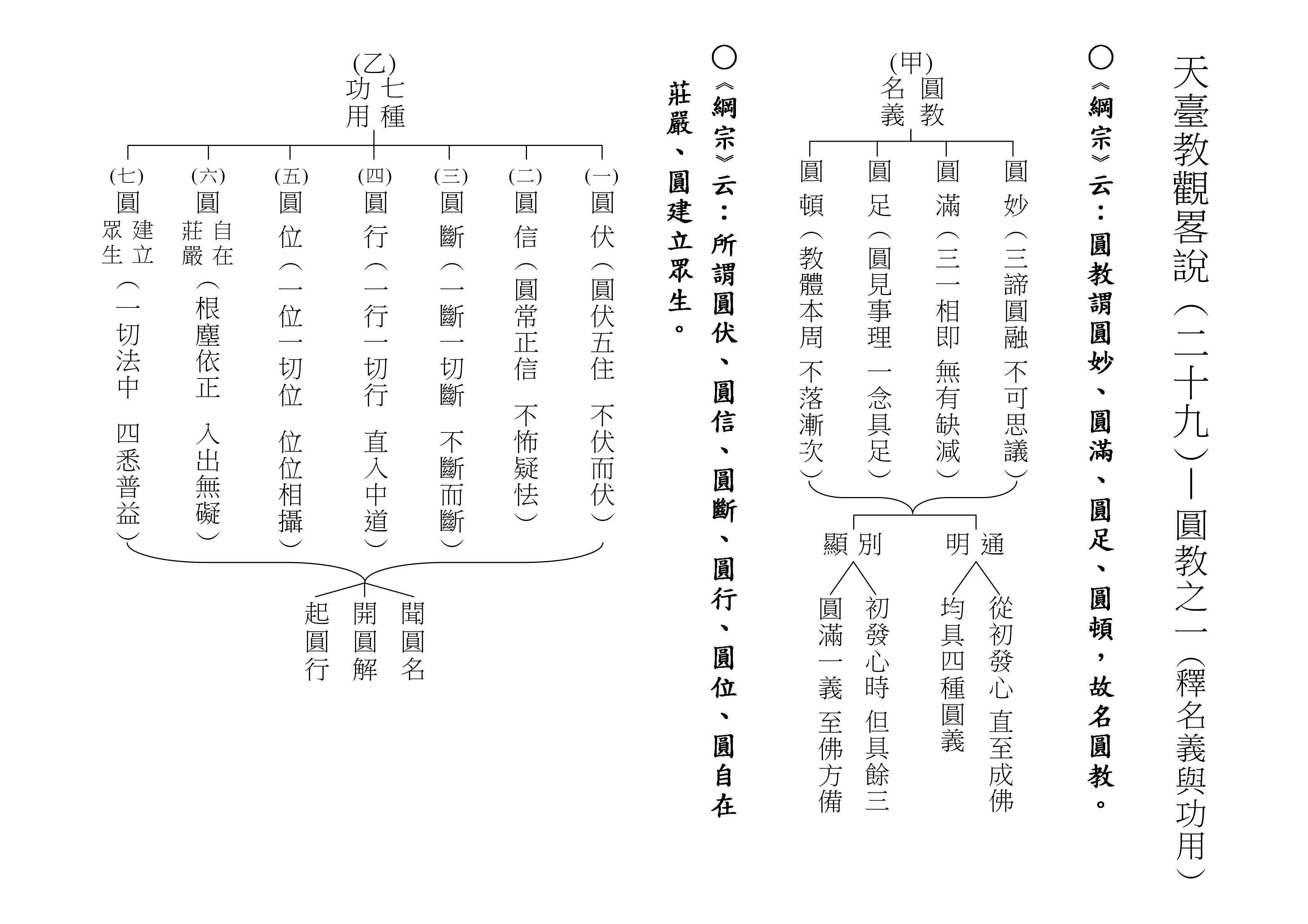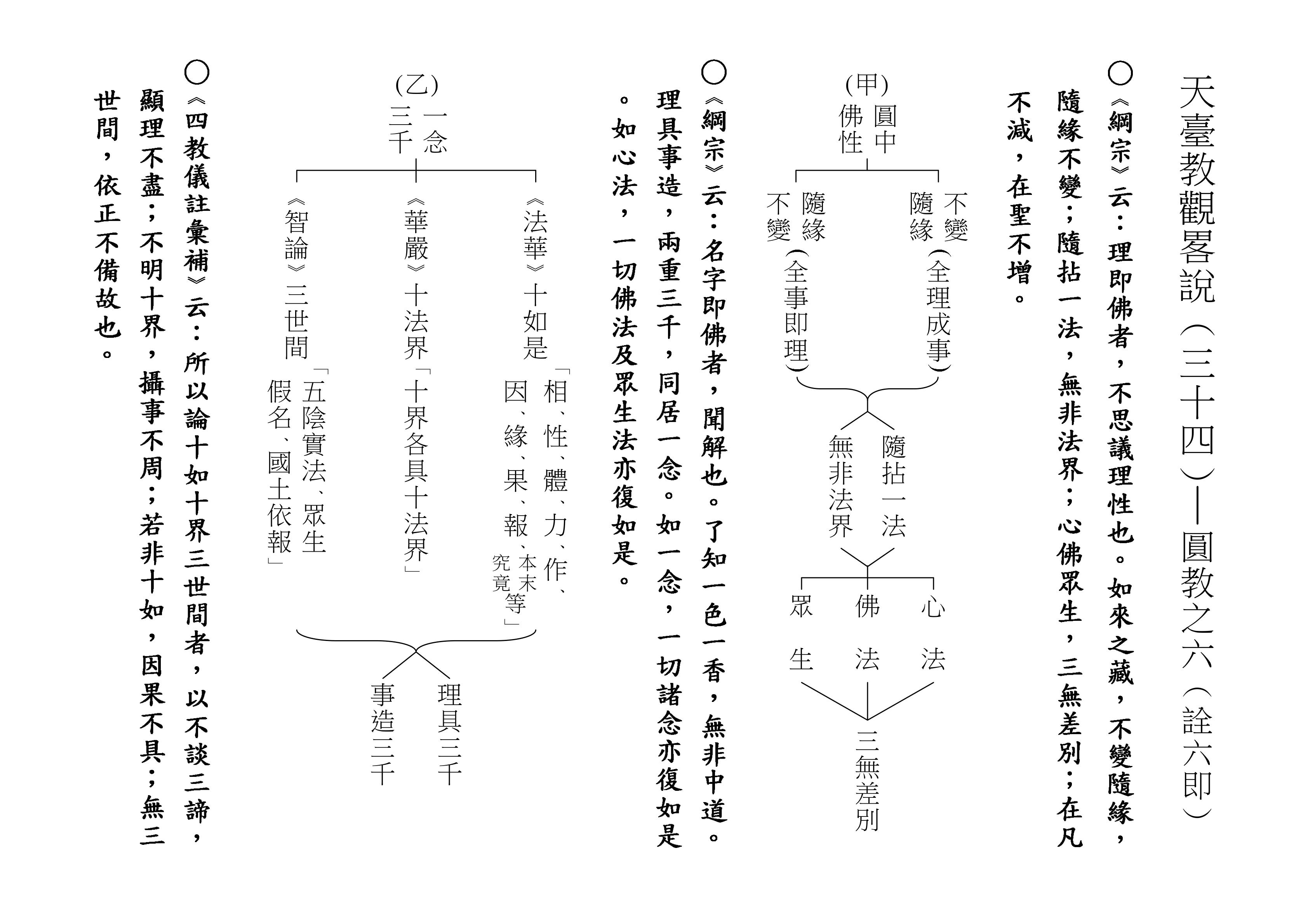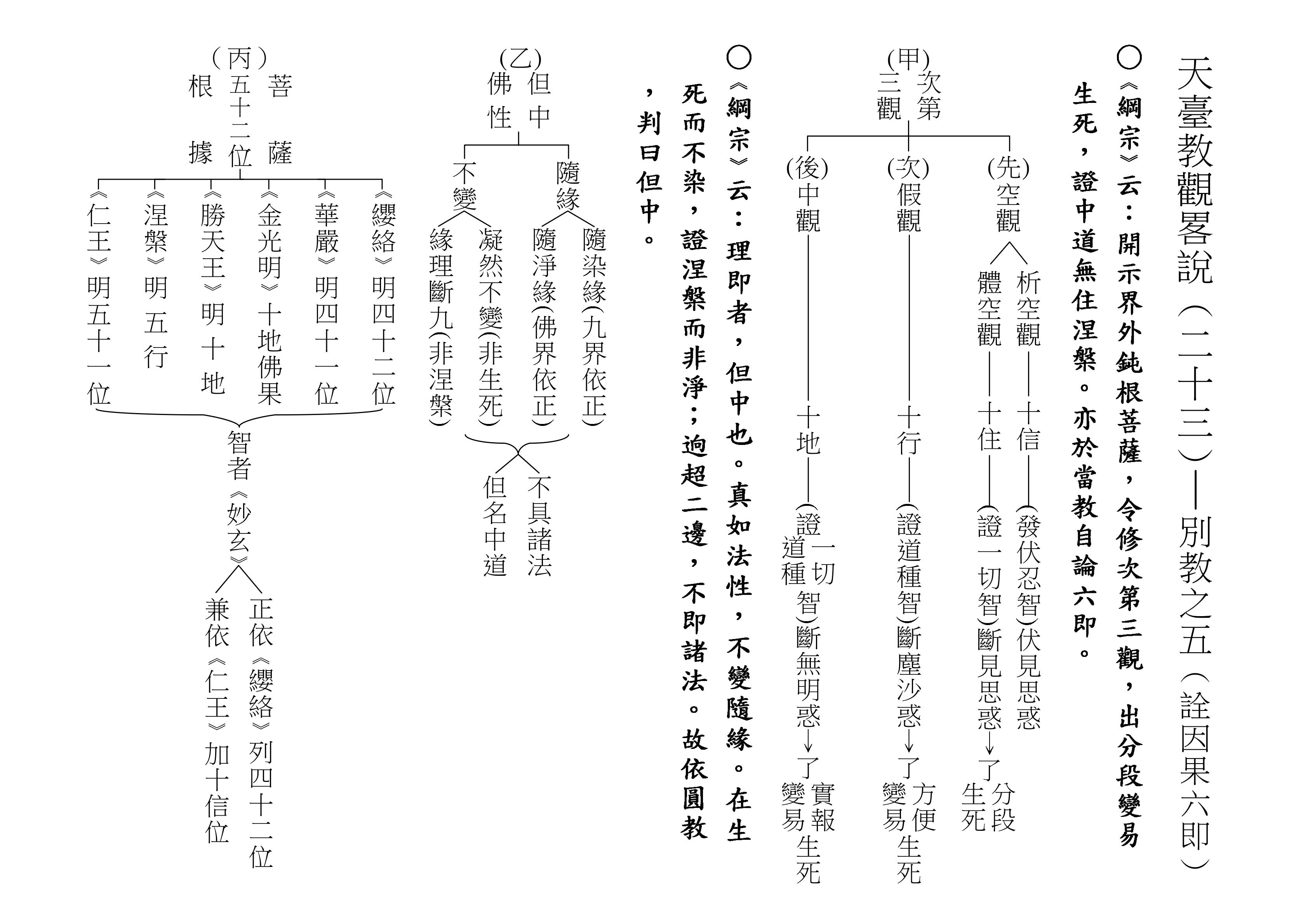 最後將圓教做一個總結,《綱宗》云:「此教名最上佛法」,那是最上等的,純粹的佛法,所謂純圓獨妙。「亦名無分別法」,一一法體即中道實相,體即真如法性,所以每一個法都是佛法。既然每一個法都是佛法,還有什麼可以分別的呢?「以界外滅諦為初門」,既然是隨拈一法,無非法界,一色一香,莫非中道。如(乙)表:以「無言說道,當體寂滅;但有血性,悉具佛性」,甚至情與無情,同圓種智,所以說是以界外滅諦為初門。