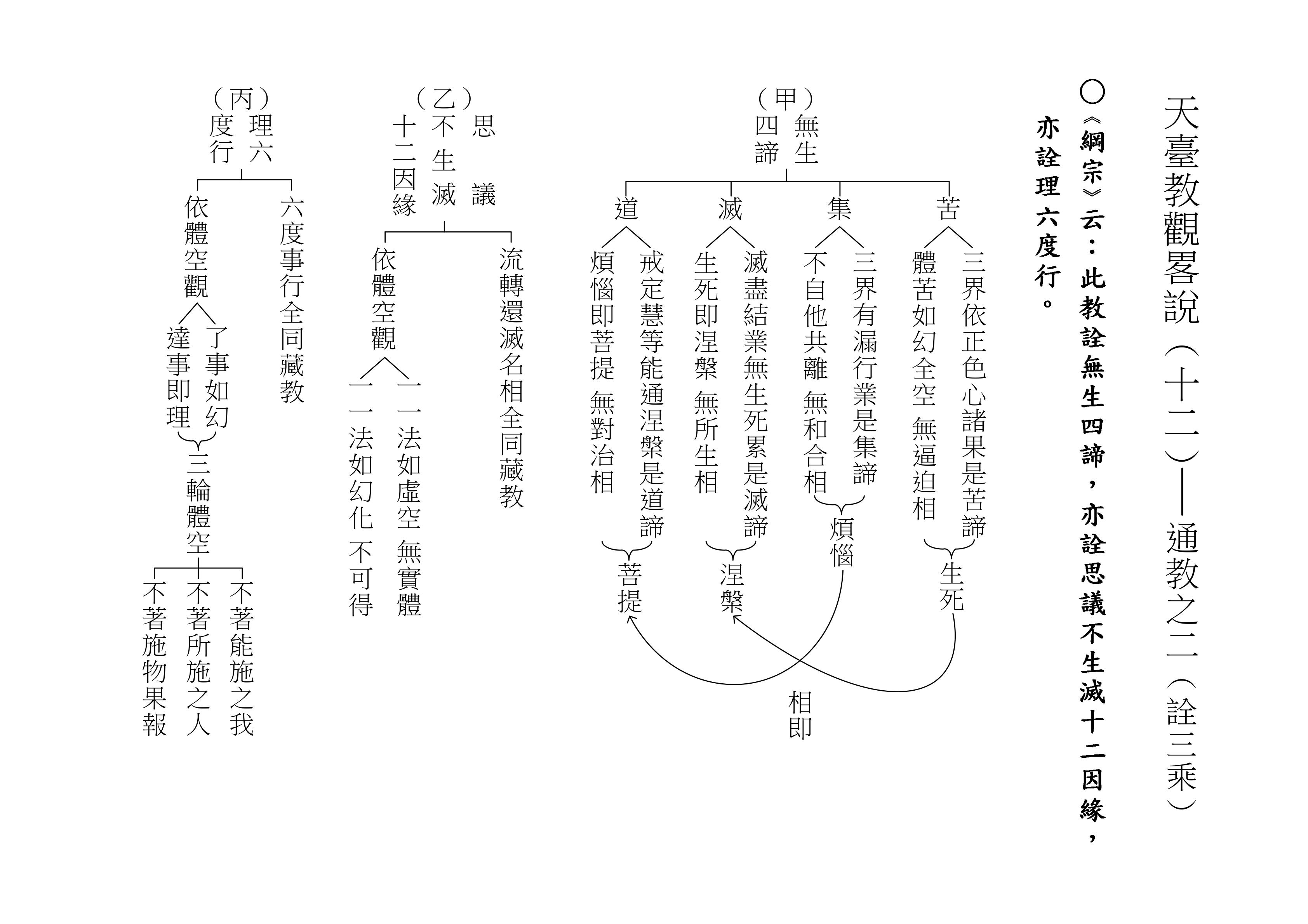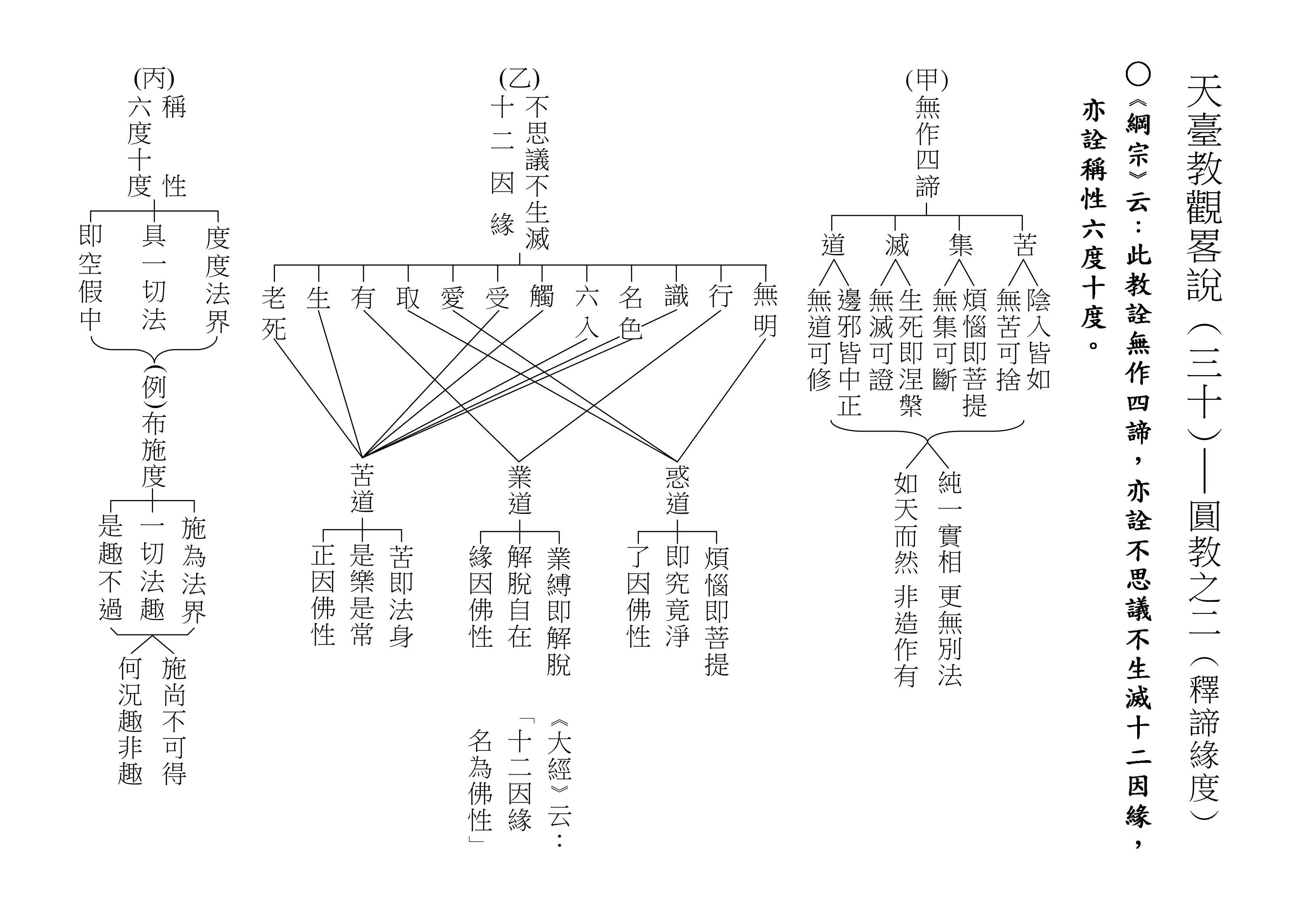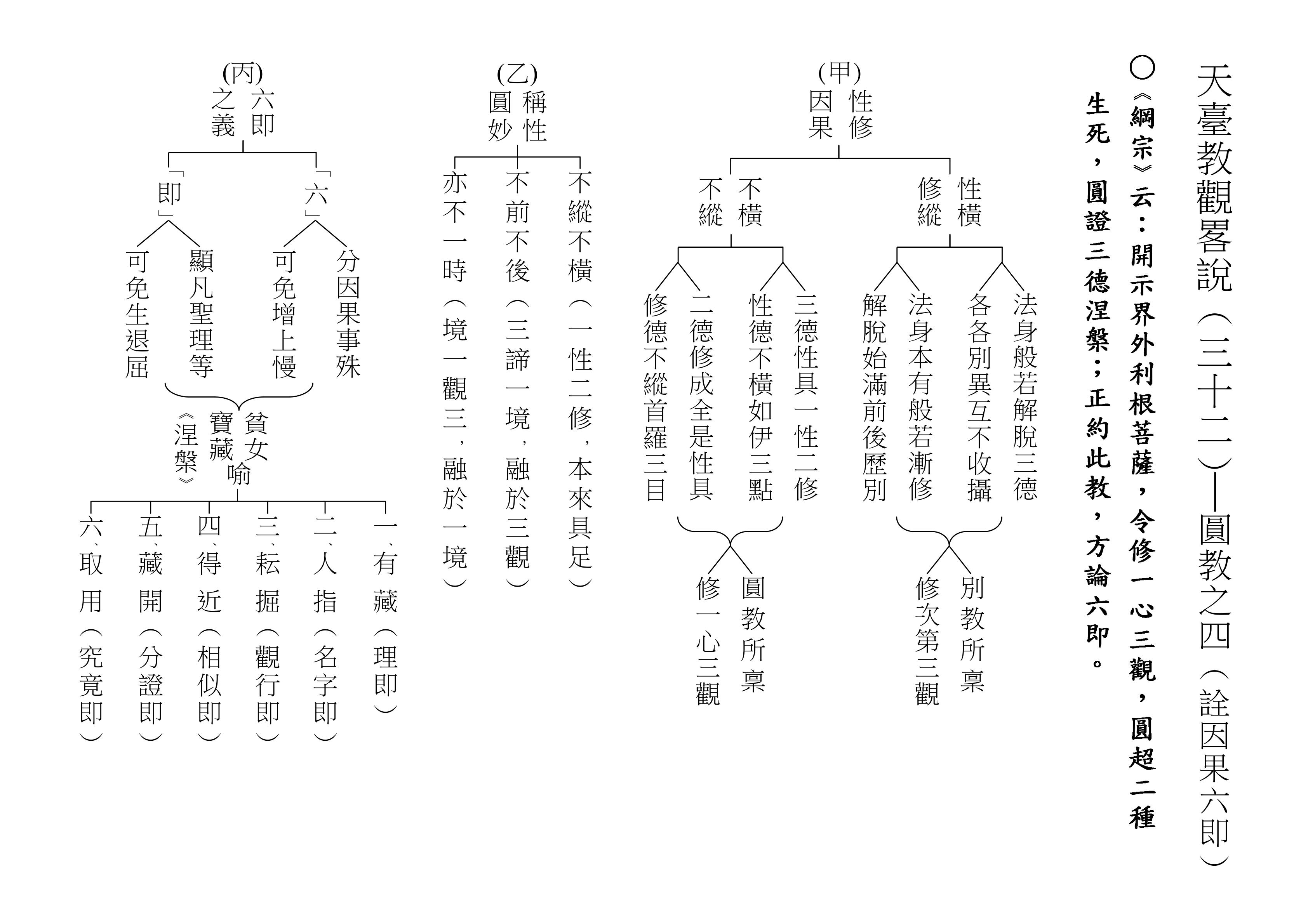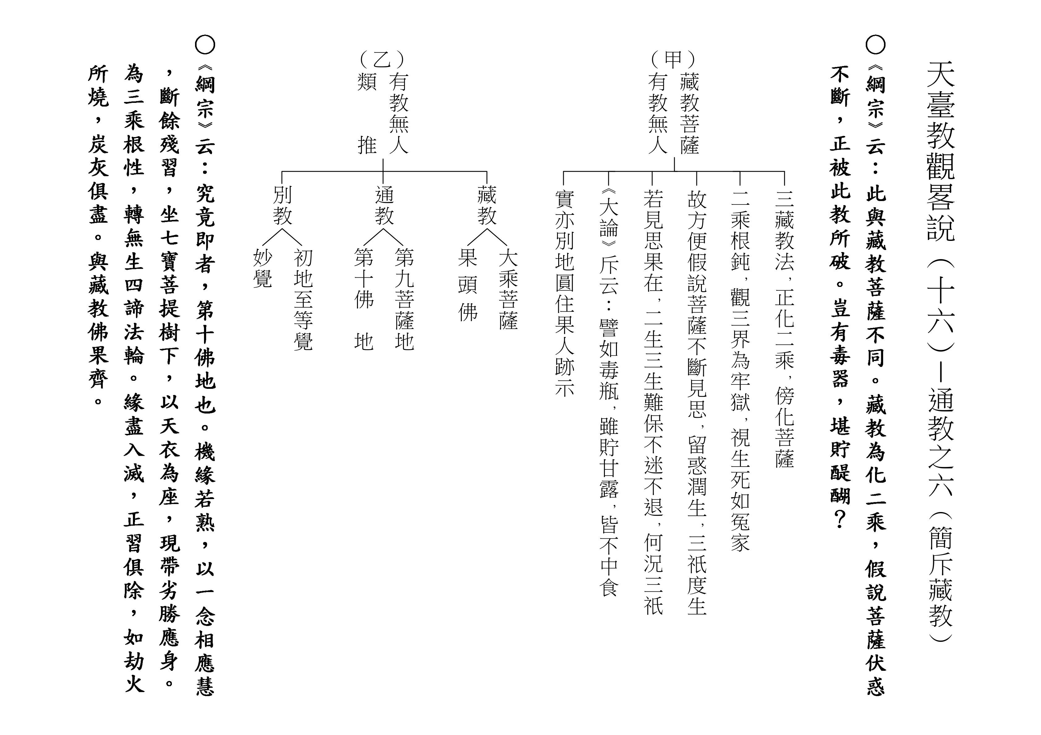 最後將圓教做一個總結,《綱宗》云:「此教名最上佛法」,那是最上等的,純粹的佛法,所謂純圓獨妙。「亦名無分別法」,一一法體即中道實相,體即真如法性,所以每一個法都是佛法。既然每一個法都是佛法,還有什麼可以分別的呢?「以界外滅諦為初門」,既然是隨拈一法,無非法界,一色一香,莫非中道。如(乙)表:以「無言說道,當體寂滅;但有血性,悉具佛性」,甚至情與無情,同圓種智,所以說是以界外滅諦為初門。