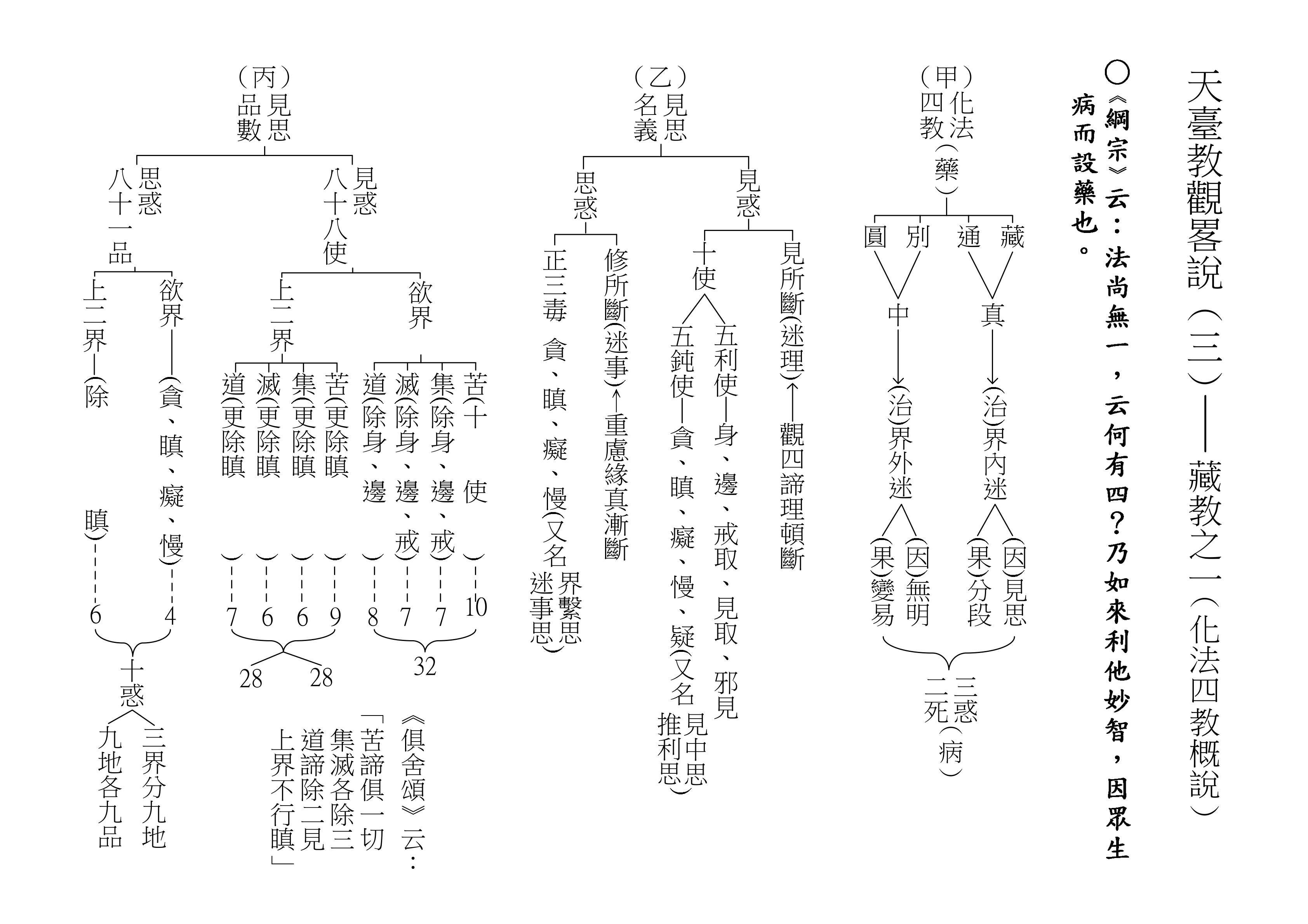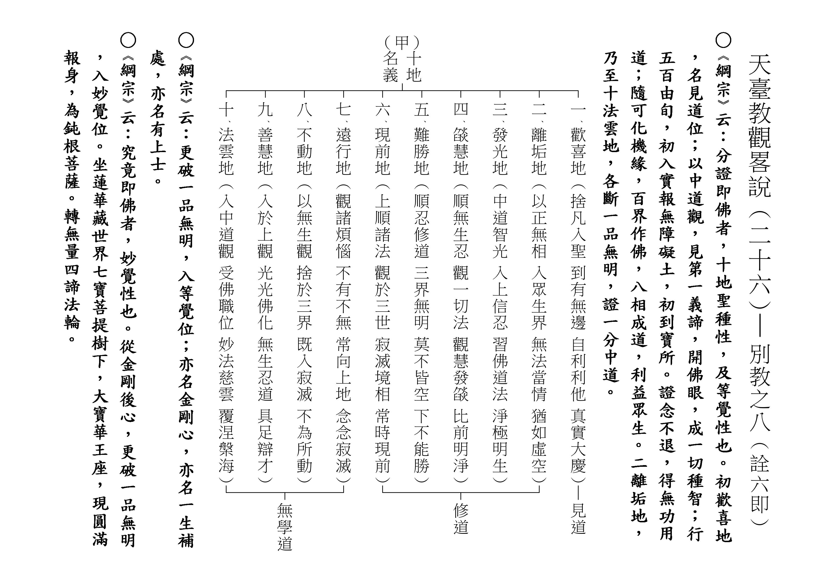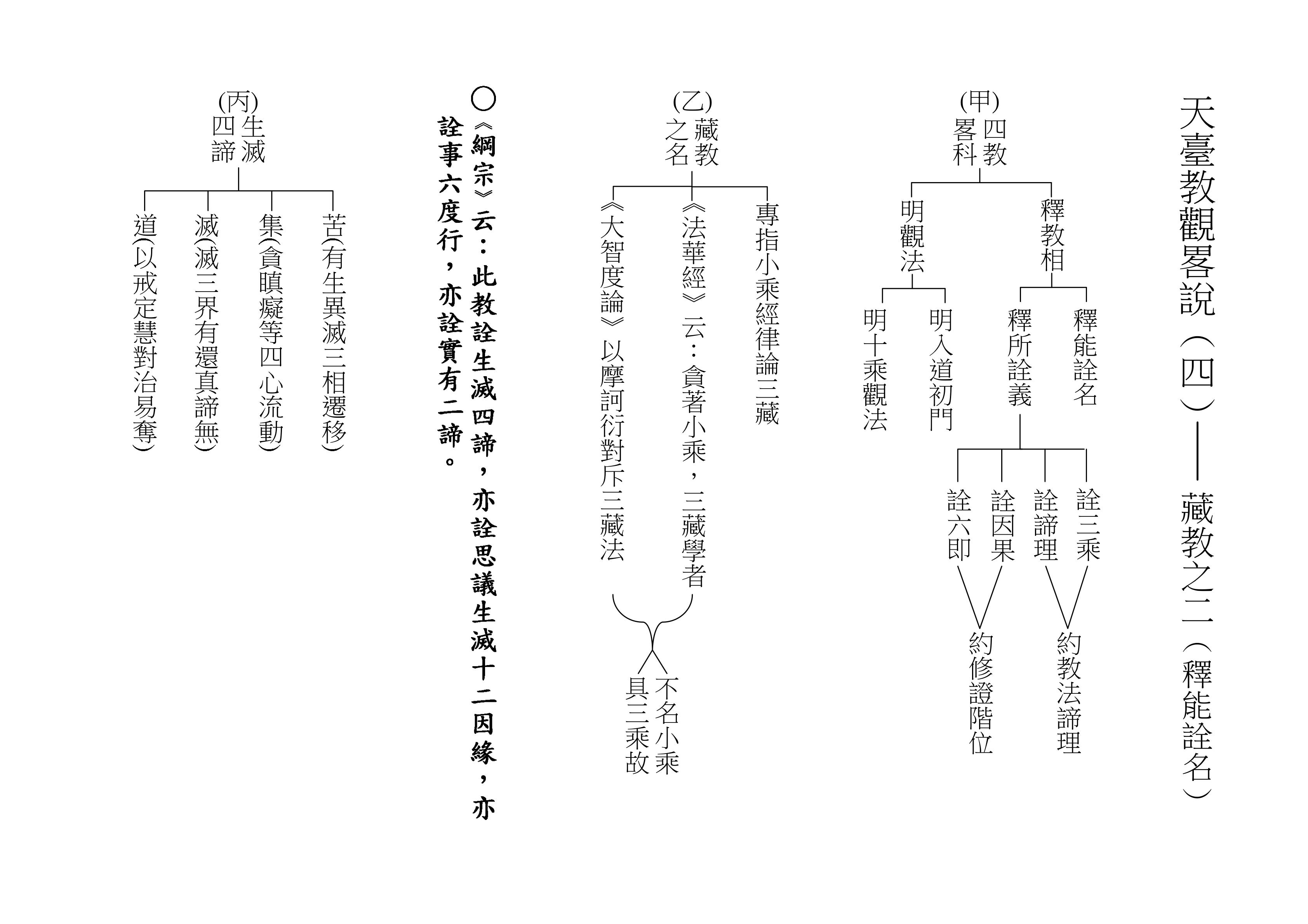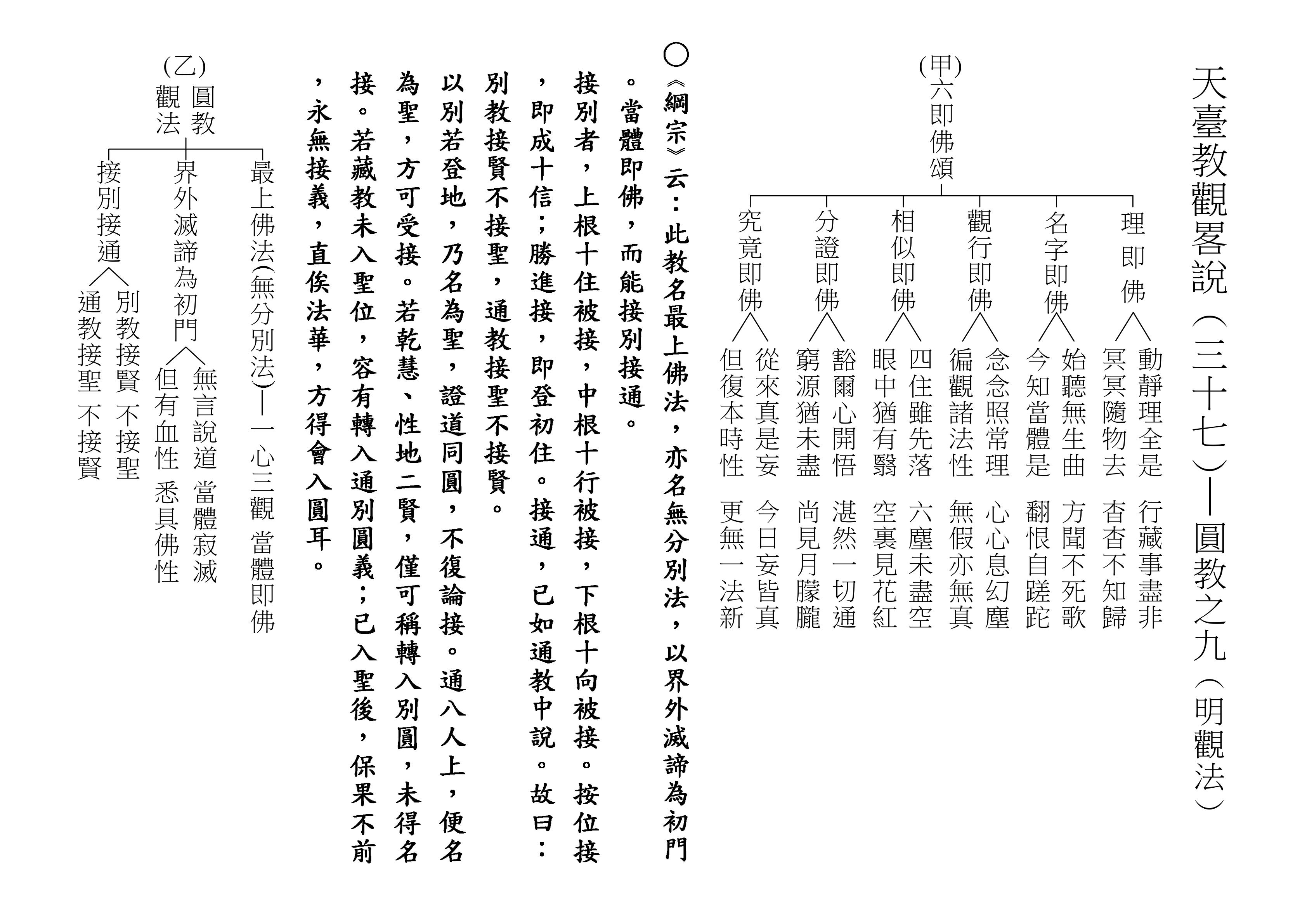 最後將圓教做一個總結,《綱宗》云:「此教名最上佛法」,那是最上等的,純粹的佛法,所謂純圓獨妙。「亦名無分別法」,一一法體即中道實相,體即真如法性,所以每一個法都是佛法。既然每一個法都是佛法,還有什麼可以分別的呢?「以界外滅諦為初門」,既然是隨拈一法,無非法界,一色一香,莫非中道。如(乙)表:以「無言說道,當體寂滅;但有血性,悉具佛性」,甚至情與無情,同圓種智,所以說是以界外滅諦為初門。
