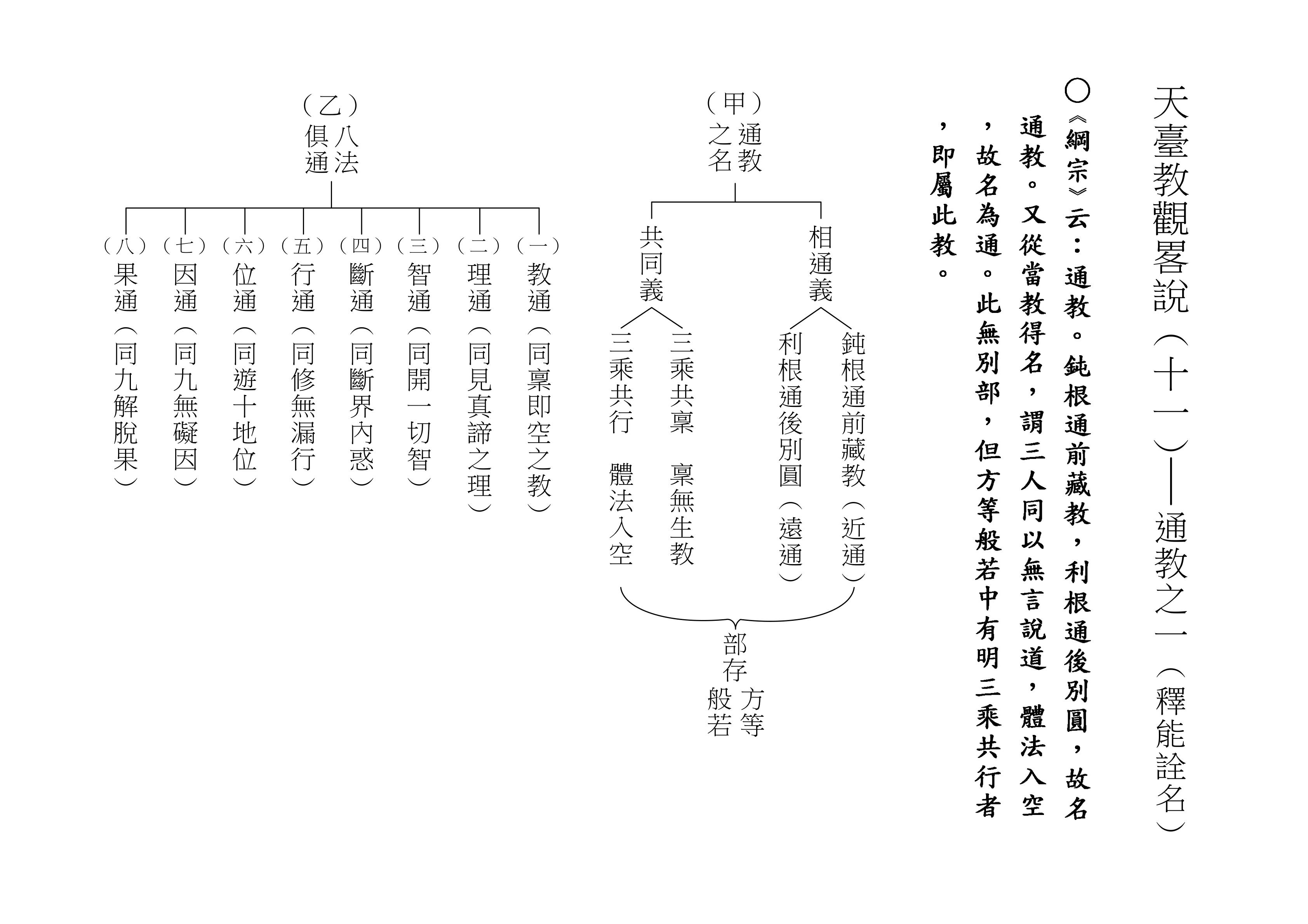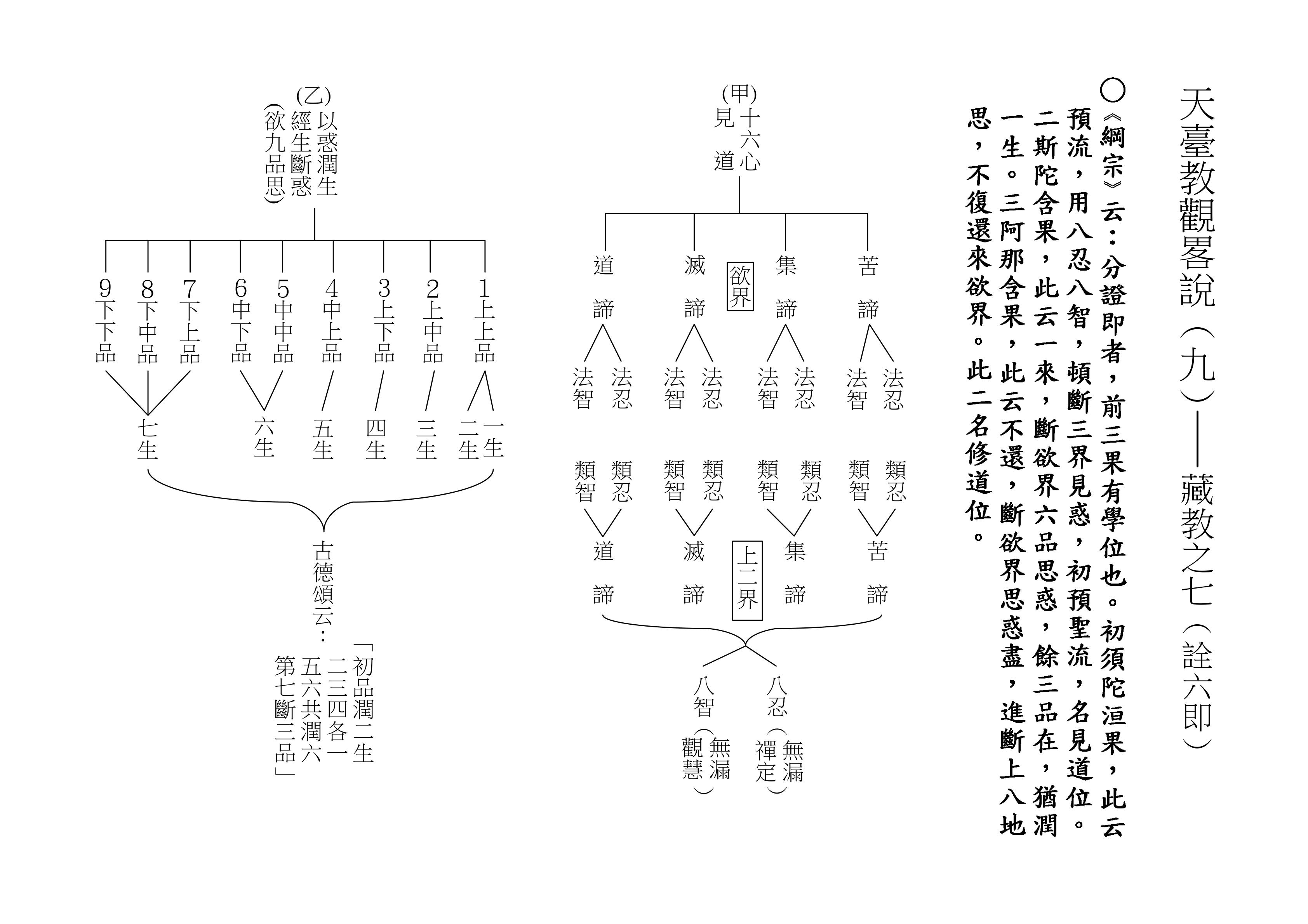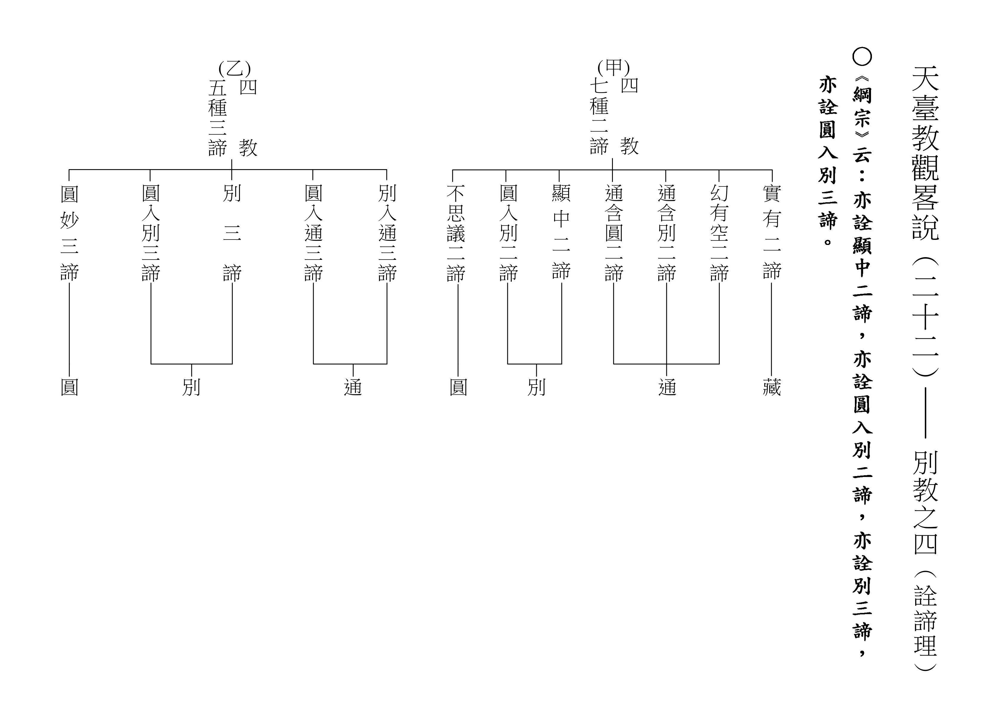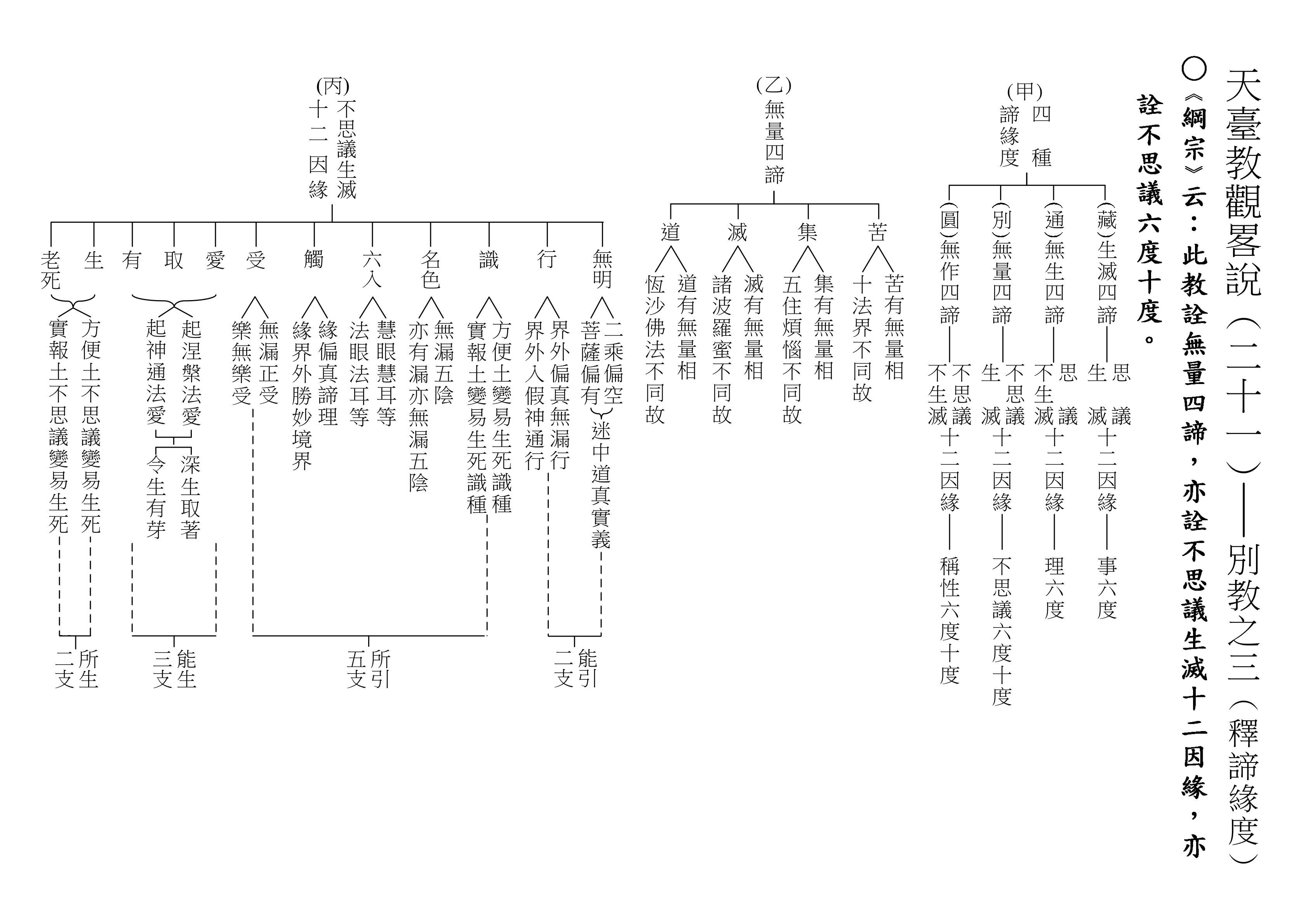 最後將圓教做一個總結,《綱宗》云:「此教名最上佛法」,那是最上等的,純粹的佛法,所謂純圓獨妙。「亦名無分別法」,一一法體即中道實相,體即真如法性,所以每一個法都是佛法。既然每一個法都是佛法,還有什麼可以分別的呢?「以界外滅諦為初門」,既然是隨拈一法,無非法界,一色一香,莫非中道。如(乙)表:以「無言說道,當體寂滅;但有血性,悉具佛性」,甚至情與無情,同圓種智,所以說是以界外滅諦為初門。