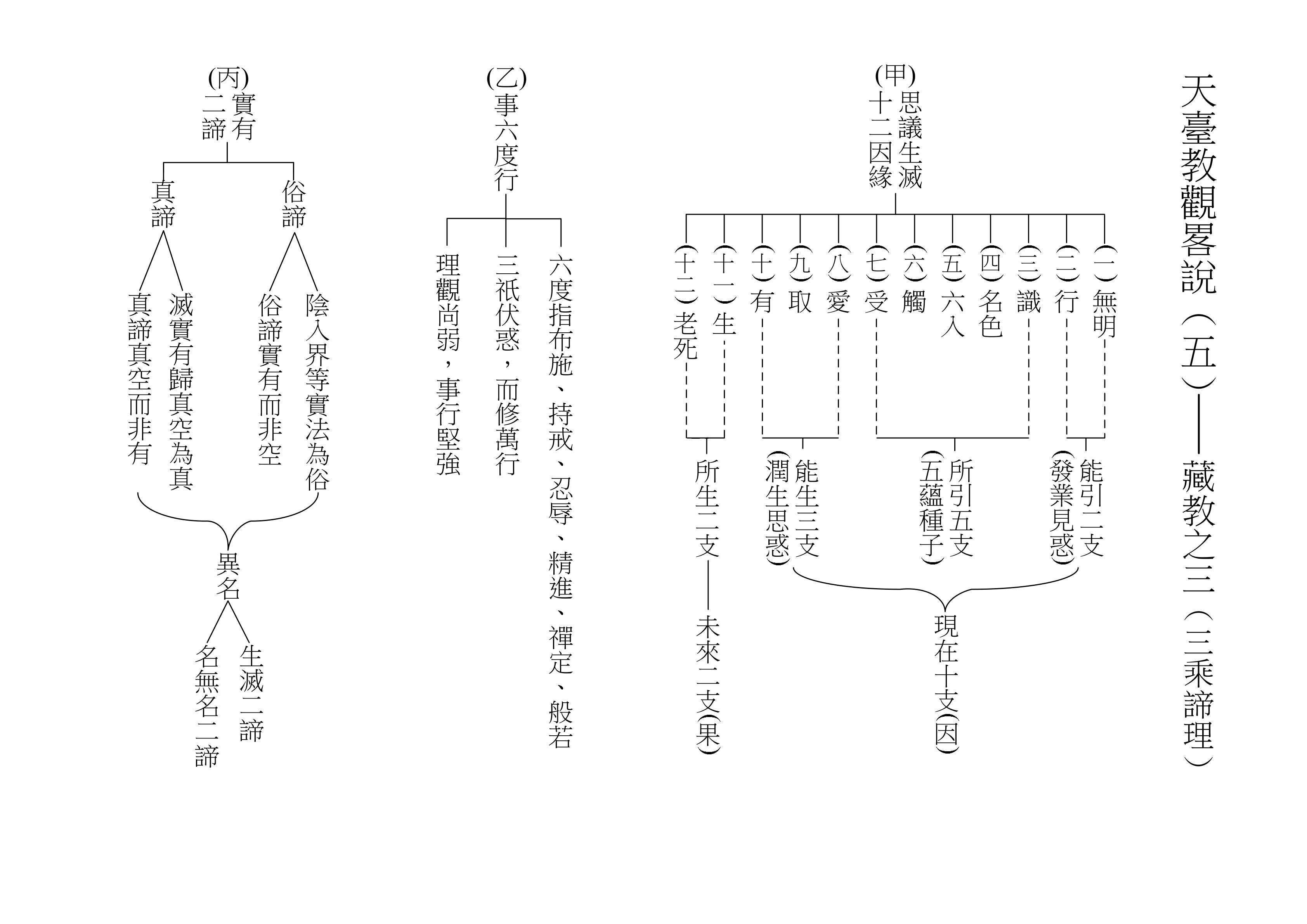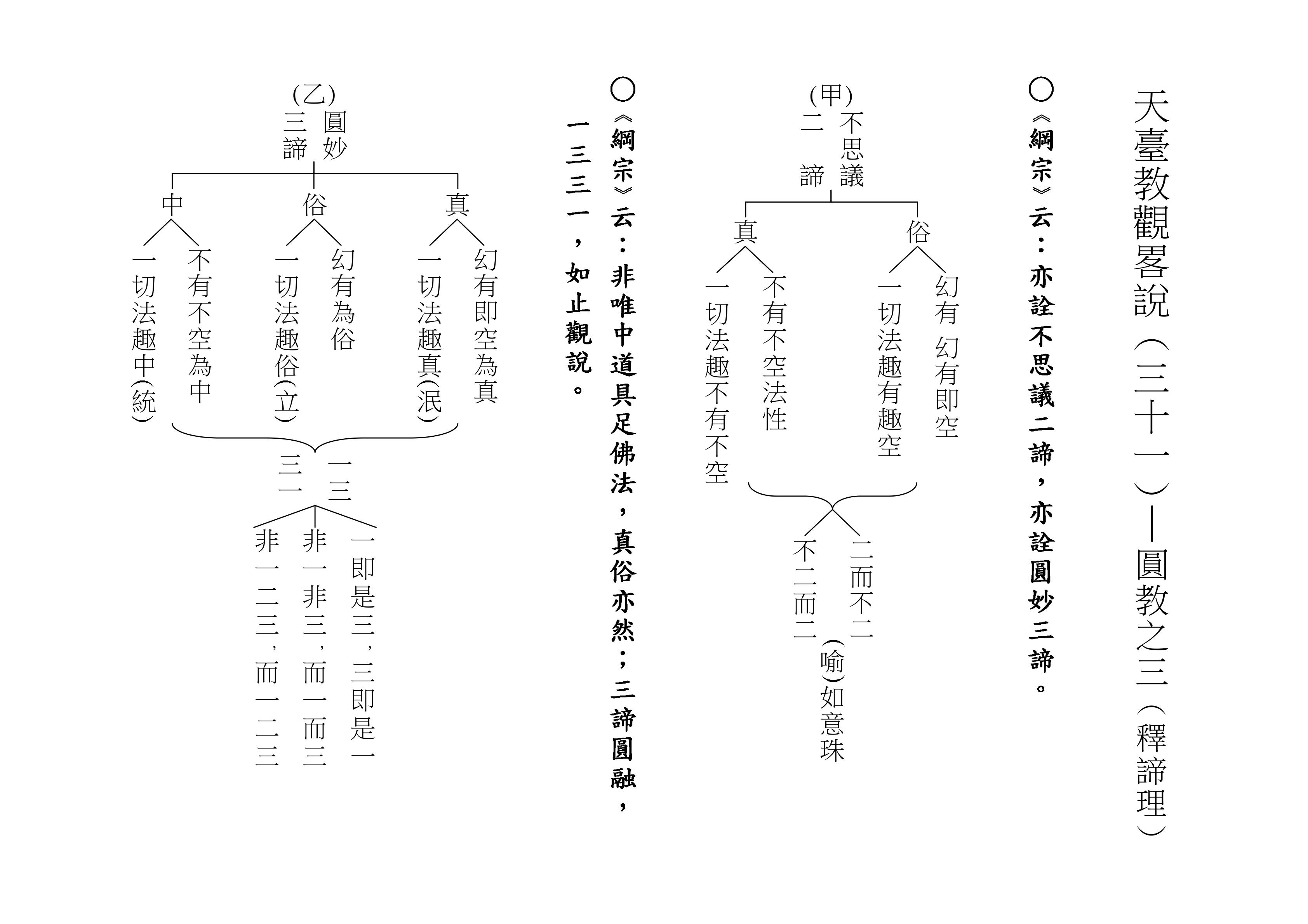 至於別、圓二教,由於志在成佛,因此必得修「空、假、中」三觀,亦即除了明白「因緣所生法,我說即是空」的道理,還必須了悟「亦名為假名,亦名中道義」的道理。
