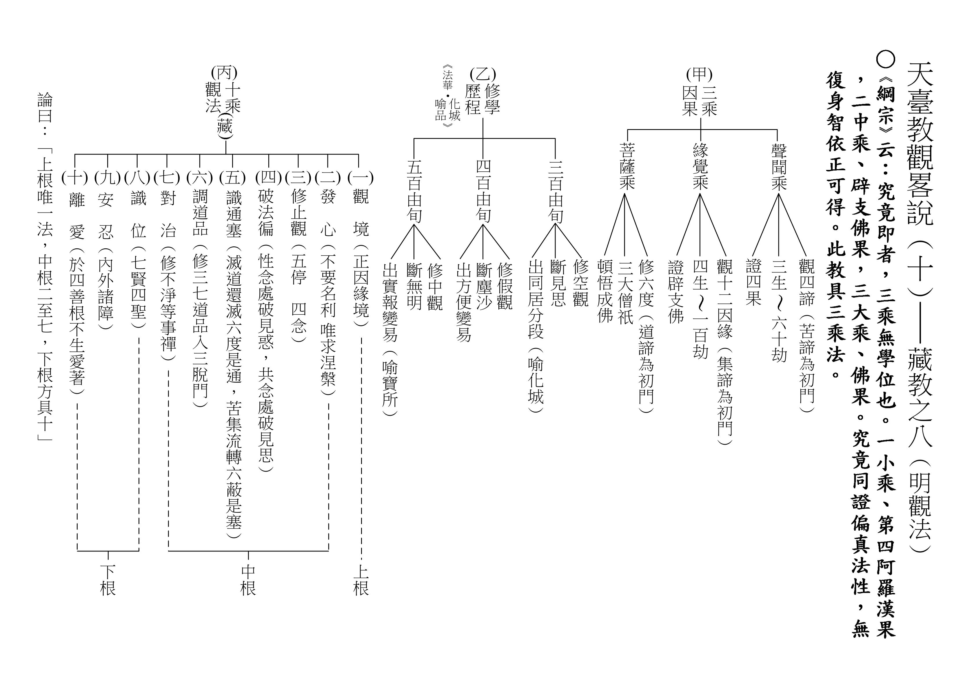 十乘觀法,第一乘就能悟入者是上根,第二到第七悟入者是中根,若是到第八,甚至第十修滿才悟入的,就是下根。《教觀綱宗》的分類,中根是二至六,第七以後為下根。上中下三根的分法,蕅益大師的《教觀綱宗》和《天臺四教儀》有一點點不同。