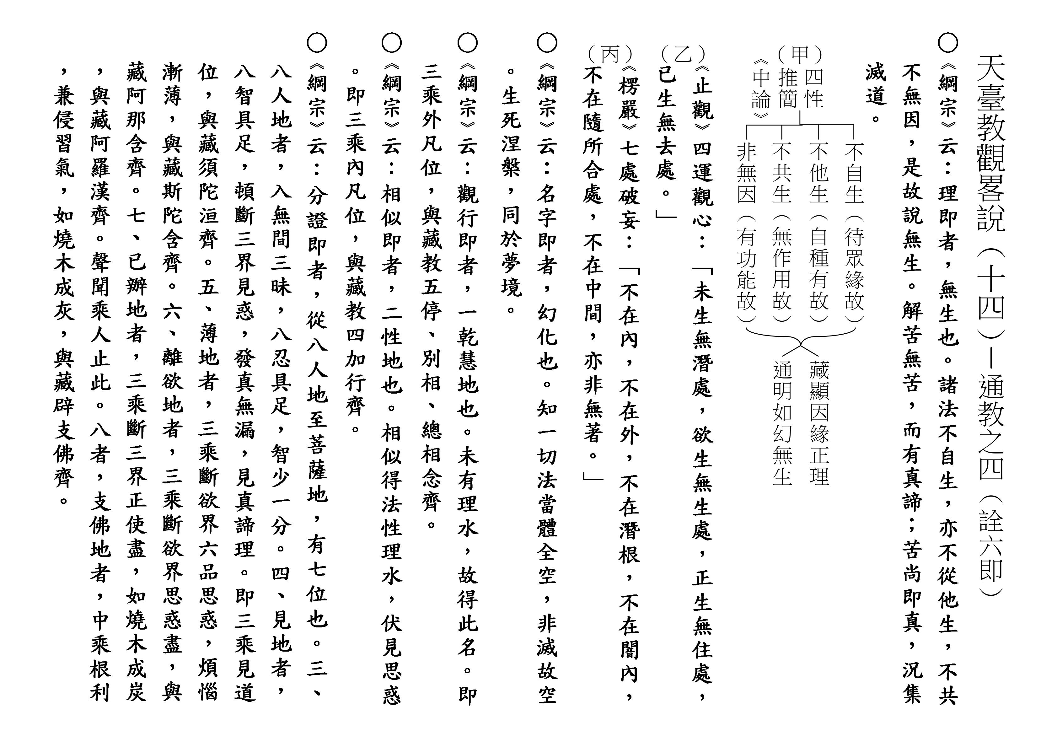 看(乙)表。在《中觀論》提出「四性推檢」,這個在講通教時已講過,《中論》說:「諸法不自生,亦不從他生,不共不無因,是故知無生。」「不無因」,無因就是自然,沒有因緣,自然而生,也不是如此。「諸法四不,是空觀」,從諸法裡頭推觀四種不生,推到最後悟入無生,這就是空觀。無生卻又無不生,所以是「萬法昭然」,這是假觀。非空非假,「即不思議境」,這就是中觀。