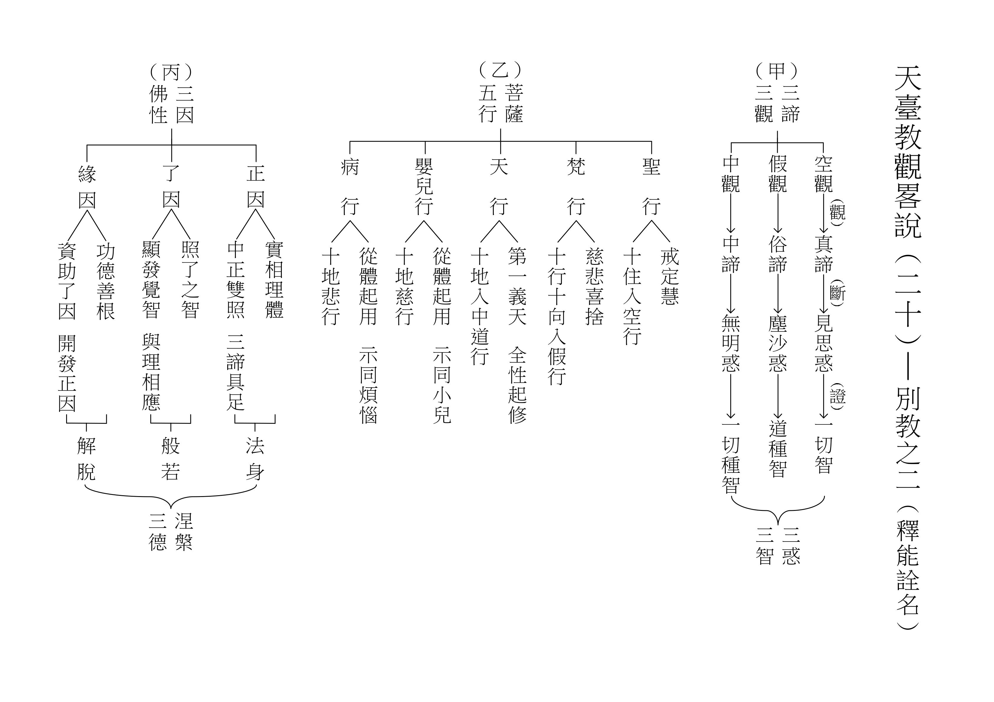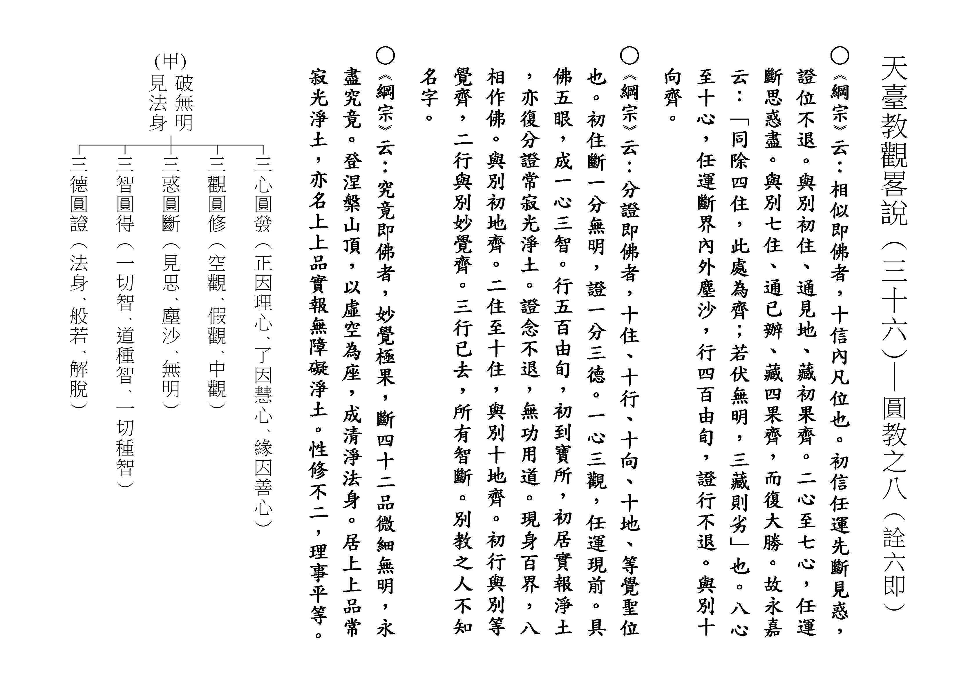 下面(甲)表,再把「破無明、見法身」作一個歸納。那就是「三心圓發」,在因地時,正因佛性、了因佛性、緣因佛性,以及理心、慧心、善心同時完整地開發出來。「三觀圓修」,空、假、中三觀同時修,任運現前。「三惑圓斷」,見思惑、塵沙惑、根本無明惑,整個斷。「三智圓得」,一切智、道種智、一切種智是圓滿證得。「三德圓證」,同時證得法身、也證般若、也證解脫。