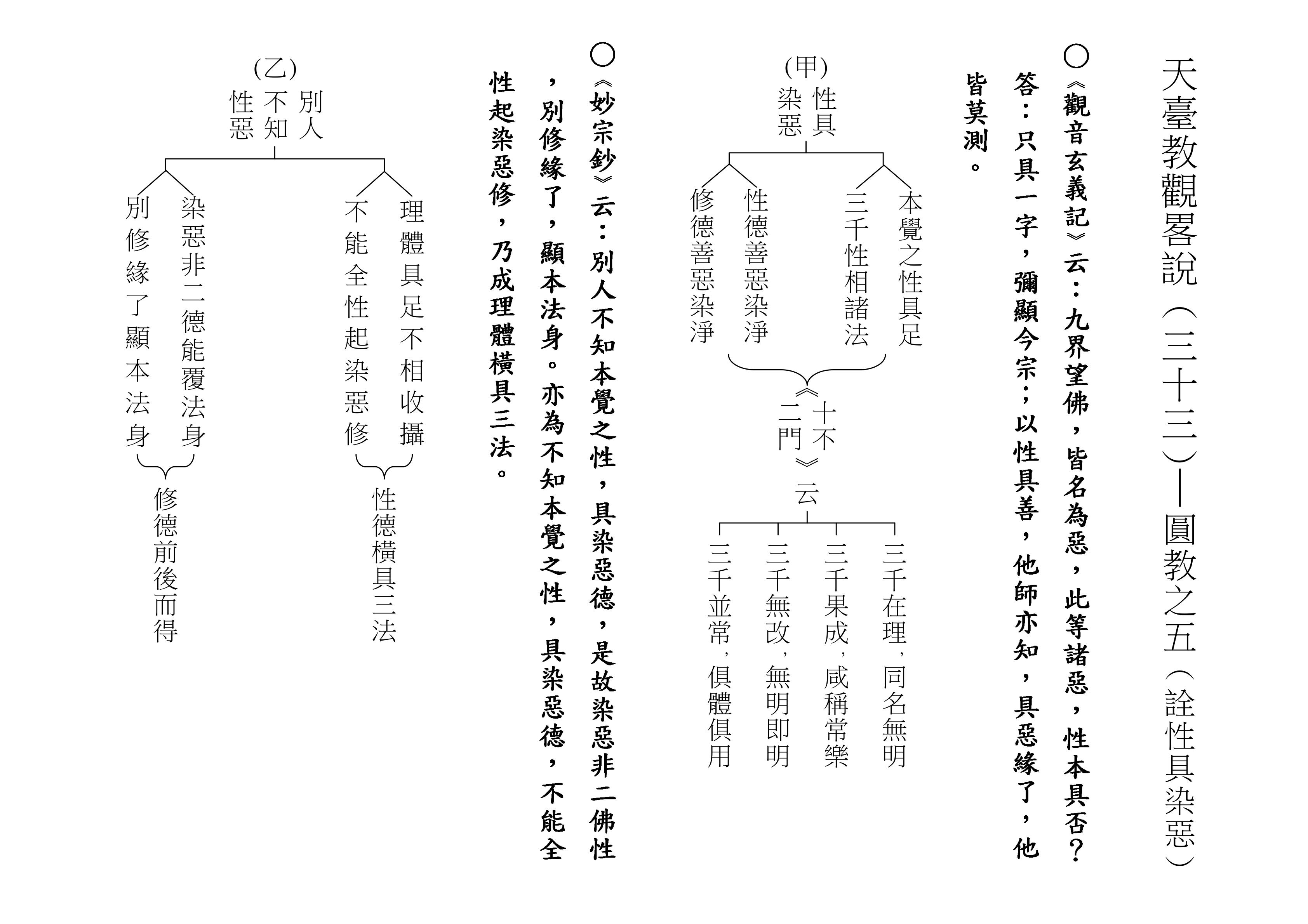 (甲)表荊溪湛然大師《十不二門》這八句話不得了,後來在四明尊者的《妙宗鈔》特別加以說明:「別人不知本覺之性,具染惡德」,別教人不懂得,我們本來覺的佛性,具足一切的染惡德。德有善德、有惡德,我們要好好修善德,不能修惡德。但是本覺就具足染惡德,別教人不知道本覺之性裡頭具足染惡德,「是故染惡非二佛性」,所以認為染惡德就不是佛性,既不是了因佛性、也不是緣因佛性。要顯露法身,必須把染惡德去除,就得「別修緣了,顯本法身」,另外得修緣因、了因。修緣因、了因就必得先修空、修假,先破除見思惑、塵沙惑等等。這樣才能夠「顯本法身」,才能顯現本來的法身。這是重要的一個關鍵,他不知道本覺之性,具染惡德。